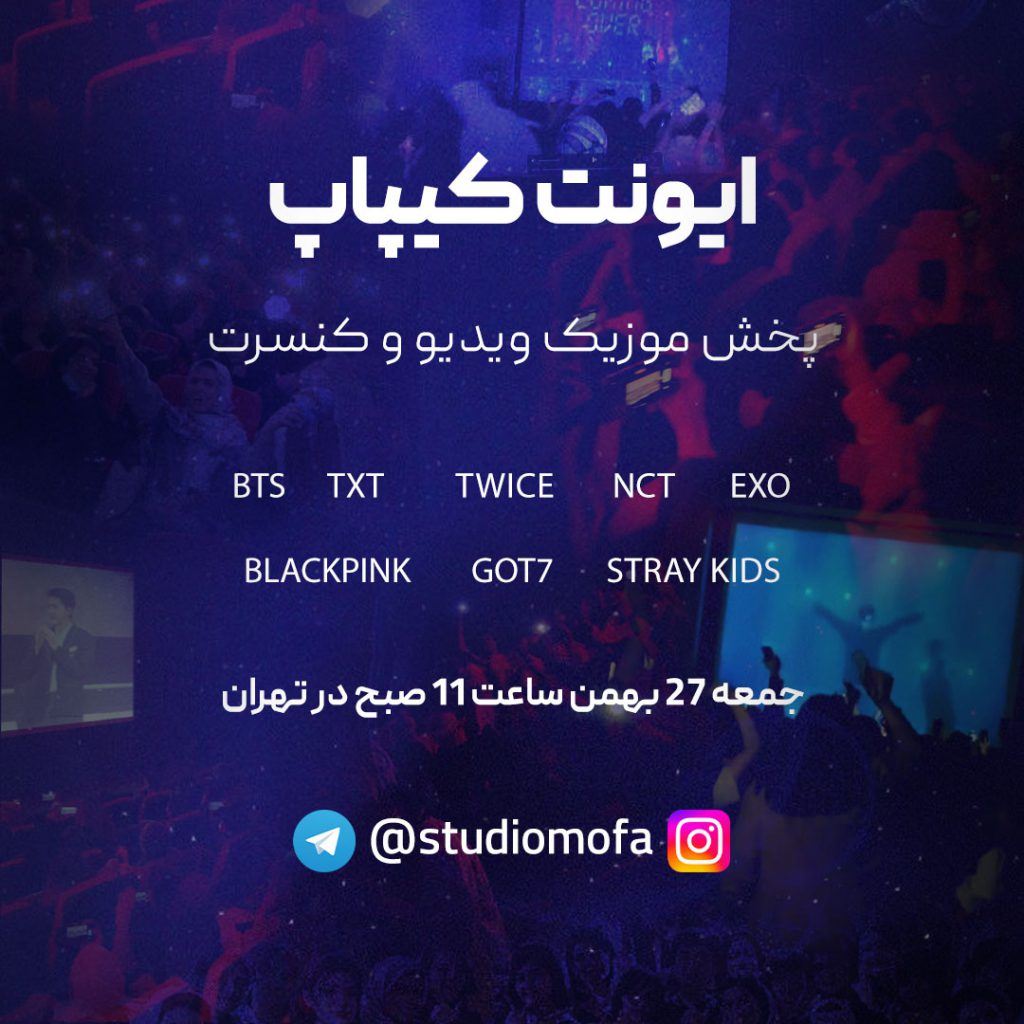 استادیو موفا اولین برگزار کننده ایونت ها و کنسرت های گروه های مختلف کیپاپ مثل اکسو، بی تی اس، بلک پینک و … از سال 1400 شروع به فعالیت کردیم و تا ایونت های مختلف زیادی در سینما و کافه های شهر های مختلف گرفتیم که میتونید ویدیوهاشون رو تو سایت ببینید.